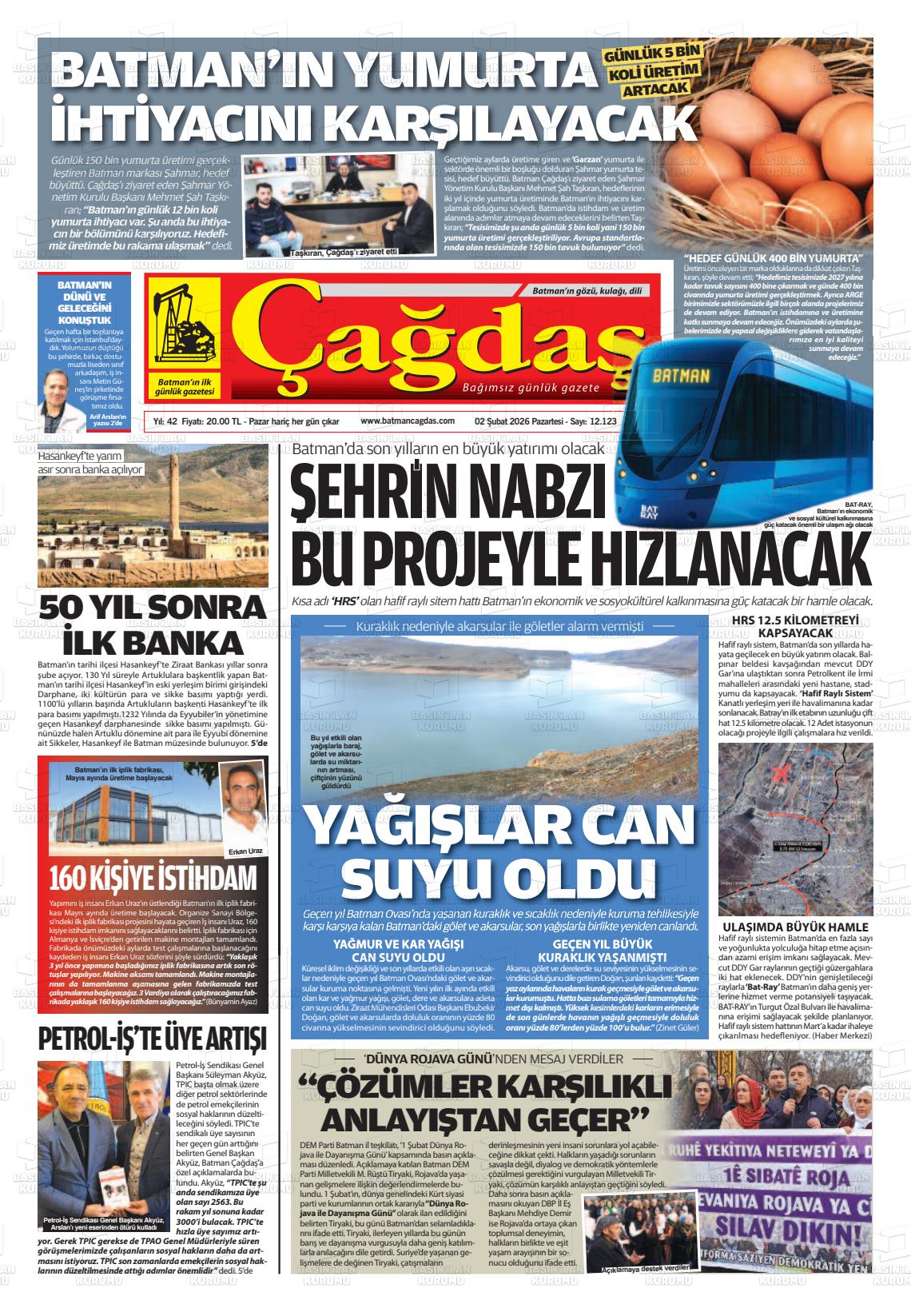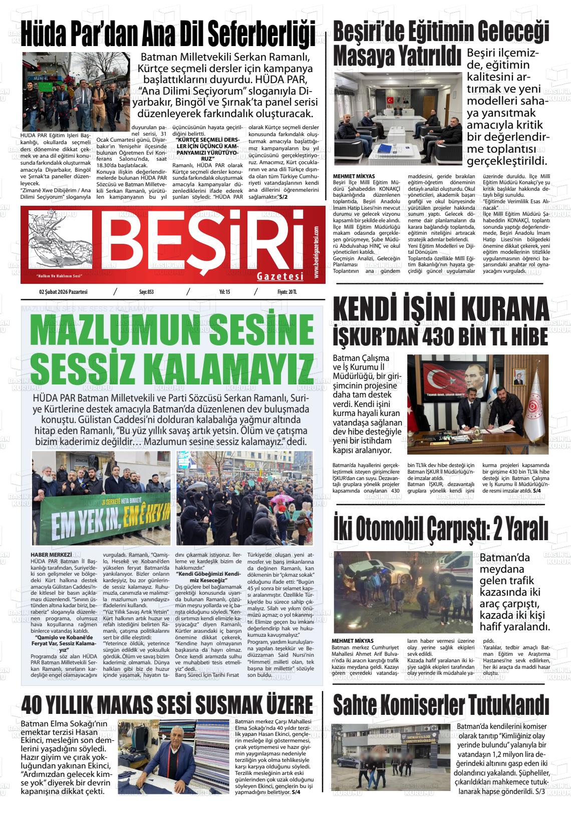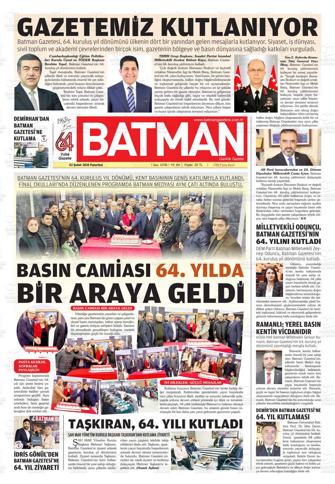 Batman Yerel Gazeteleri 02 Şubat 2026, Pazartesi Günü Manşeti