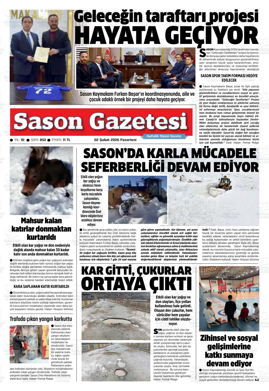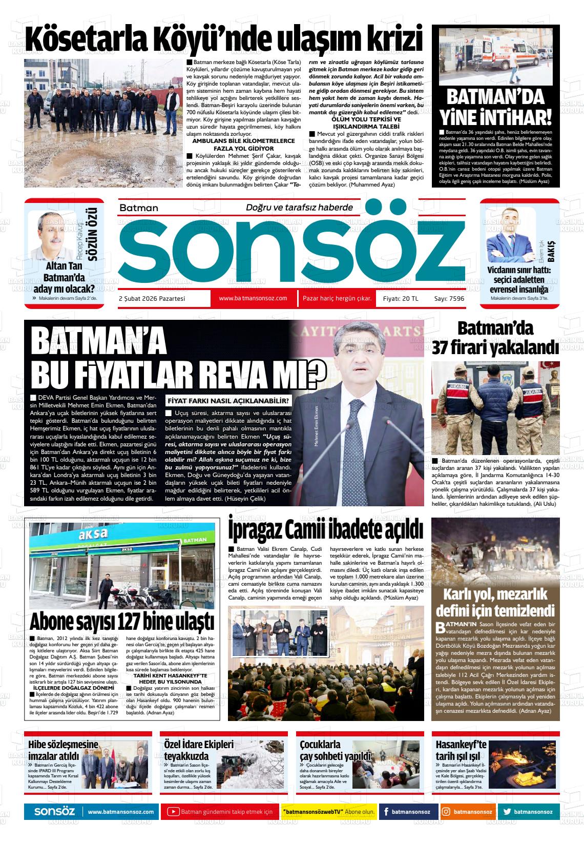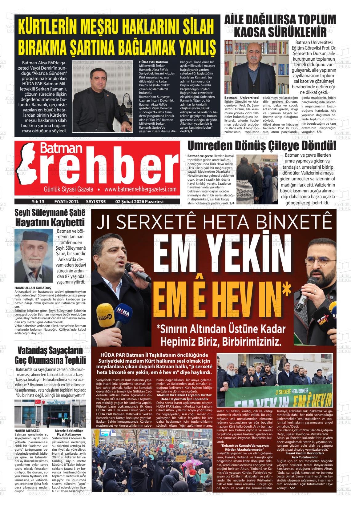 Batman Yerel Gazeteleri 02 Şubat 2026, Pazartesi Günü Manşeti